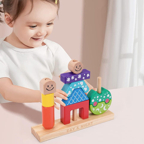 If you are looking for a really interactive Montessori toy, this wooden stacking puzzle toy is a great choice. It features ten wooden blocks of different colors and shapes that can be matched into different intuitive designs – from modeling real-life situations to setting the stage for imaginative play.